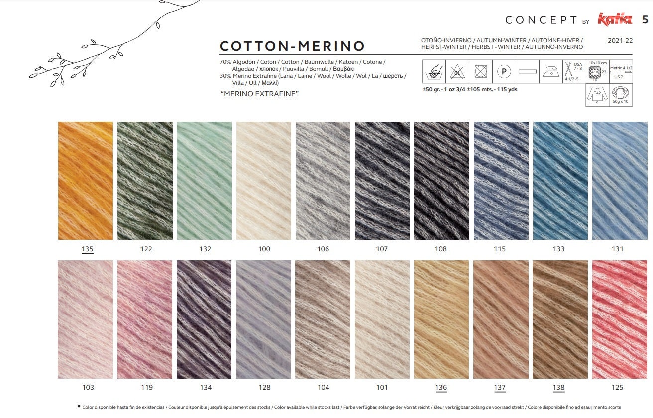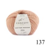 Warm cotton yarn with very light weight merino wool available in delicate pastel colors. Cotton-Merino is a fantastic yarn for youthful dresses and elegant between season coats. Magnificent natural fiber blend for making soft textural jumpers and occasion wear women’s jackets.