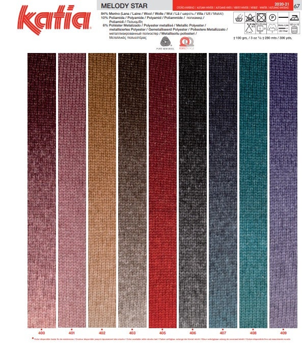 Katia Melody Star content: 84% merino wool, 10% polyamide, 6% metallic polyester.