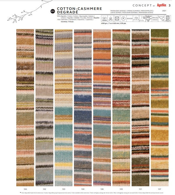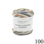 Šiame 200 g Concept by Katia Cotton-cashmere degrade verpalų ritinėlyje yra daugiau nei 600 metrų spalvotų verpalų – mėgaukitės besikeičiančiomis ramiomis spalvomis ir leiskite būti nustebinti rezultatu.